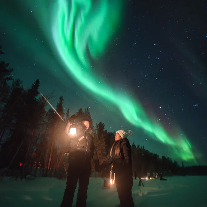 With no fixed route, every tour is a unique adventure. You’ll stand under some of the darkest skies in Lapland, far from city lights, while your guide captures stunning images of you and the auroras.