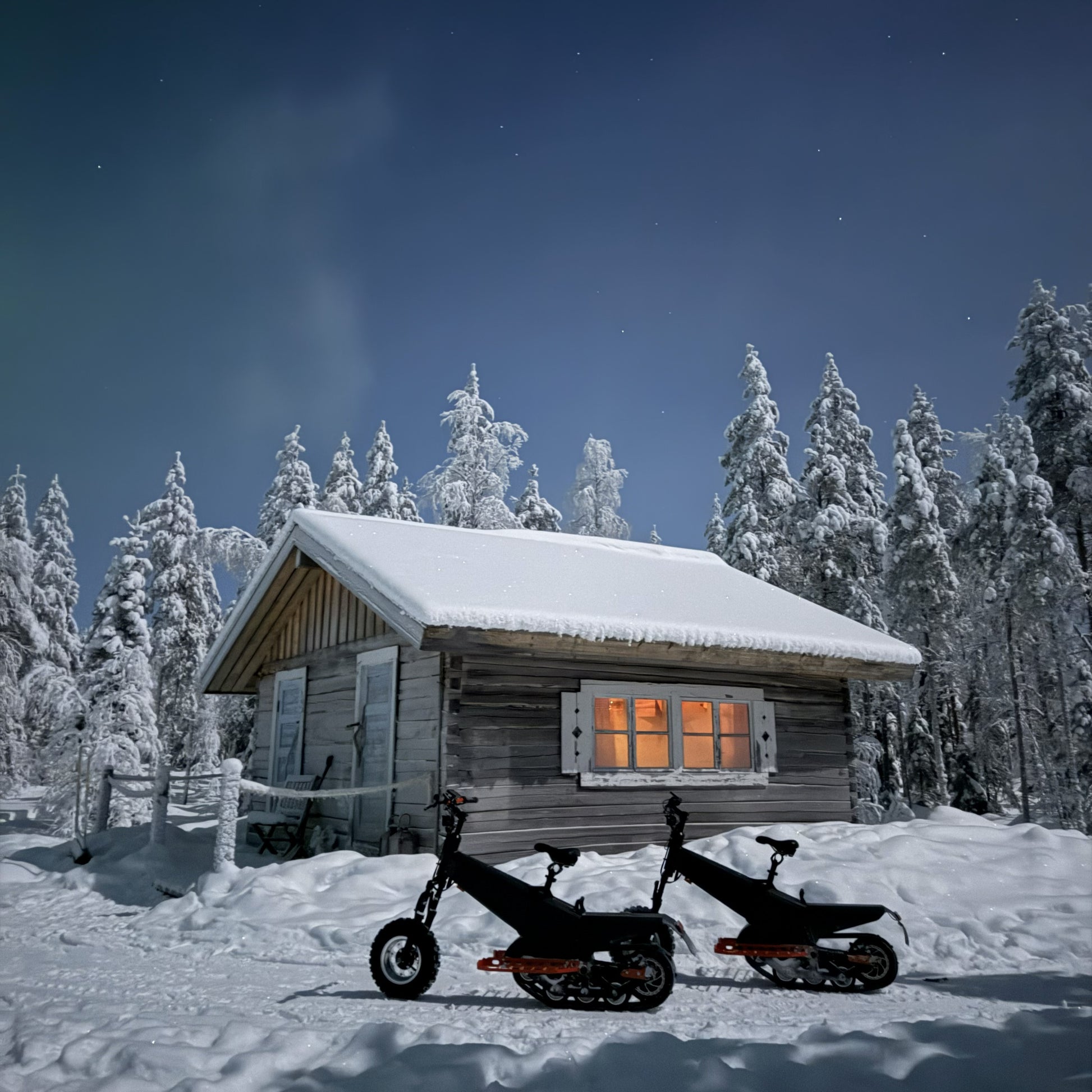 Enjoy a quiet and unforgettable adventure on Electric Reindeer through a snowy Finnish forest to a cozy Arctic forest log cabin. There, warm up by the fire with hot glögi and authentic Finnish treats.